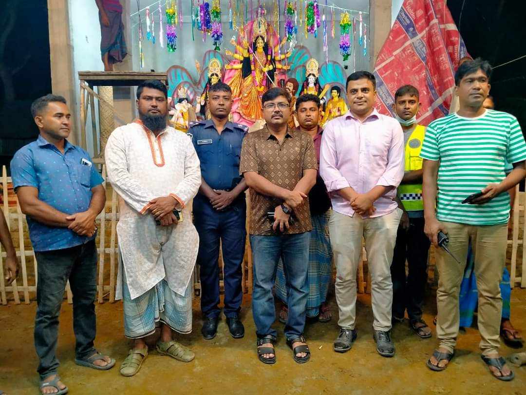 কে এম সাইফুর রহমান, গোপালগঞ্জঃ আসন্ন শারদীয় দূর্গাপূজা শান্তিপূর্ণ ভাবে উদযাপন নিশ্চিত করার লক্ষ্যে মন্দির থেকে মন্দিরে ঘুরে বেড়াচ্ছেন গোপালগঞ্জ সদর থানা পুলিশ। এরই অংশ হিসাবে বৃহস্পতিবার গোপালগঞ্জ সদর থানার অফিসার ইনচার্জ (ওসি) মোহাম্মদ আনিচুর রহমান অন্যান্য অফিসার ও ফোর্সদের সাথে নিয়ে গোপালগঞ্জ সদর থানাধীন সাতপাড় ইউনিয়নের বিভিন্ন পূজা মন্ডপ ঘুরে দেখেন।